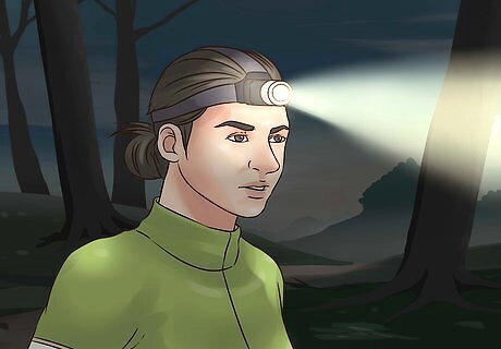 Use a headlamp or flashlight. If you don’t have many streetlights near you, or if you’re walking a woodland trail, bring a flashlight or strap on a hands-free headlamp. Having a portable light will help you see where you’re going when walking for exercise at night.