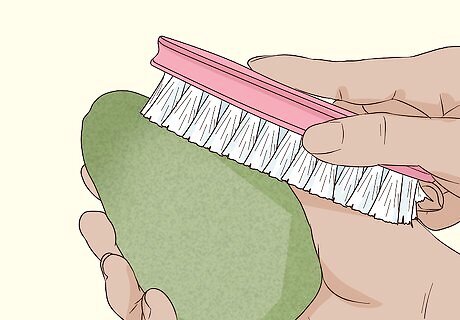 Clean dirt and other residues off the avocado skins with a vegetable brush. As you hold the avocado under running water, take a clean vegetable brush and scrub the surface of the avocado gently. Do this until there is no longer any dirt or other visible residues on the skin. Do not use soap, bleach, or specialty fruit washes. They are not more effective than running water. If you do not have a vegetable brush, use a new toothbrush. Do not use your hands. Avocado skins are grooved and may be covered with artificial wax that can trap pathogens. It is impossible to get all the trapped bacteria out with only your hands.