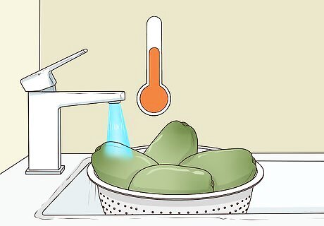 Place the avocados under cool or lukewarm running water. Do not fill the sink with water and leave the avocados in it, as this does not effectively remove dirt. Simply turn on the water and hold the avocados under it. Make sure that your water is potable, or suitable for drinking or washing food. If possible, use distilled water or bottled water, which has been filtered to get rid of contaminants.