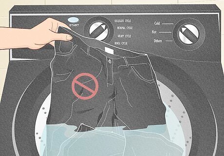Dark clothing loses a little color every time you wash it. Denim, especially, has black dye that washes away during each wash cycle. So, don’t wash dark clothes as often as the rest; only wash clothing that’s very dirty or starting to smell. Many times, clothing with a small stain that’s clean otherwise doesn’t need to be washed at all! Small stains can usually be treated without a washing machine. Blot stains with a white cloth and a mixture of water and dishwasher detergent. Use ½ cup of water and 1 teaspoon of detergent. After blotting out the stain, rinse the area by blotting it with plain water.