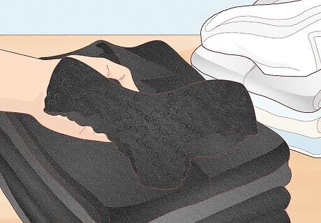 Separate items based on color and fabric type. Dark clothes (black clothes especially) can bleed onto lighter shades in the wash. Go through your dirty laundry piece by piece; create one pile for dark-colored clothes and one for light clothes. Then, separate the piles again by fabric type; wash heavier fabrics (like jeans and towels) separately from lighter fabrics (like t-shirts). Remember: just because you have a pile of dark clothing doesn’t mean they should all be thrown into the wash together. Fabric type can affect the type of wash a piece of clothing needs! If possible, Put delicates (like lacy underwear and bras) in their own pile and wash them separately. Consider how dirty each piece of laundry is. Don’t wash super dirty clothes with items that only need a light wash. Sorting your dark clothing before washing can also protect the fabric from lint and pilling, which can make it look faded and aged.