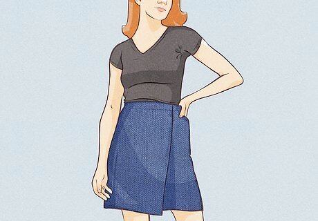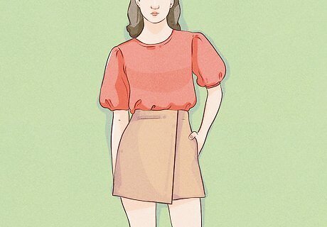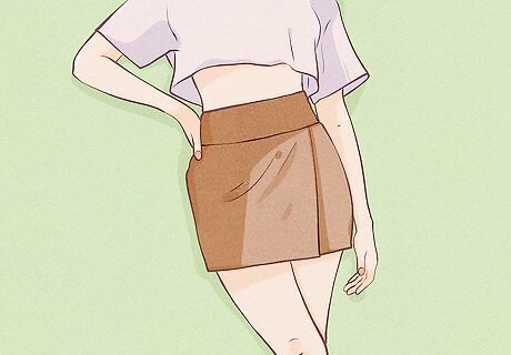 Get daring by wearing a crop top with a high-waisted skort. High-waisted styles are typically made to come up to the narrowest part of your waist, which is a flattering look for most body types. Make the most of this slimming effect by matching your skort with a crop top in your favorite style. If you don’t want to show skin, look for a crop top that ends just a little below the top hem of the skort. If you don’t mind showing a little midriff, you can opt for a shorter top. You can wear this look with a strapless crop top and wedge heels if your style is more glam, or go for a boxy cropped T-shirt and high-top sneakers for a cool rocker look. Crop tops are perfect for Zara-style skorts, which resemble a wrap skirt that comes to 2 points in the front. The name comes from the retailer who first created the skirt, although many other brands have released their own takes on the look.