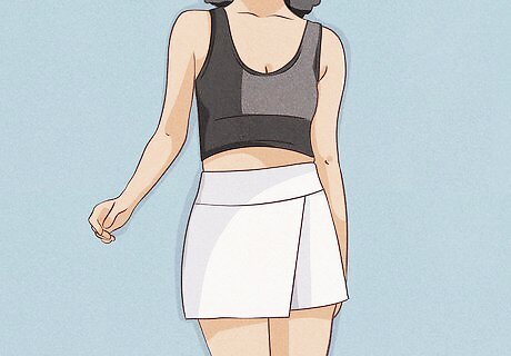 Wear an athletic skort with a tank top or sports bra for a casual workout look. Skorts are a great way to look feminine while you’re working out, without any of the inconveniences of wearing a skirt. Look for a skort that offers some compression for a supportive fit that will have you looking as good as you feel. Then, toss on your favorite workout top—or even just a sports bra, if that’s your style. T-shirt style workout tops are fine with this look, too, but you might want to stick to a fitted style. An oversized tee can get in your way during an intense workout. Tip: Make sure to wear the appropriate shoes for any workout. If you’re not sure what shoes you should be wearing, ask a trainer! Athletic skorts are often made from fabrics that have a lot of stretch, and they may wick away moisture as well.