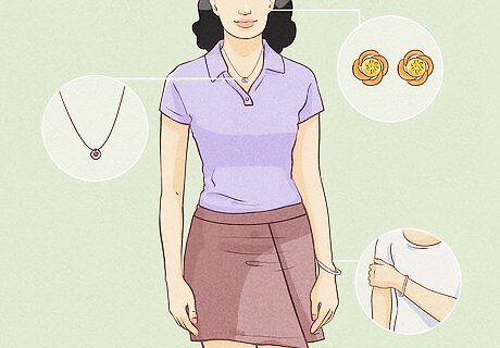 Keep your accessories simple. Since skorts tend to look casual, don’t overdo it with piles of fancy jewelry. A few simple pieces are fine, like a tennis bracelet, stud earrings, or a pendant necklace. And if you’re rocking a bold style, don’t be afraid to try a graphic statement piece, like a chunky necklace. Just keep the rest of your accessories minimal to balance the look. If you’ll be wearing your skort for an intense workout, it’s probably better to avoid jewelry altogether.