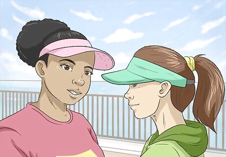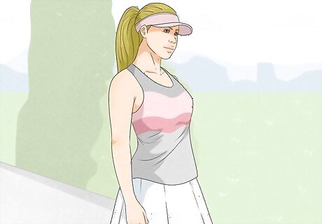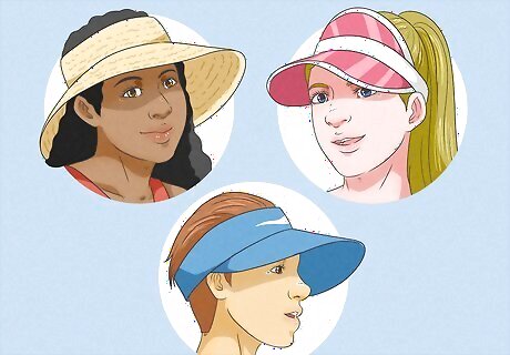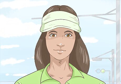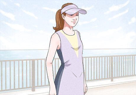 Visors come in a variety of styles and materials you can play around with. Find one that works best for the look you’re trying to achieve. Some visors are also more functional than others if you’re planning some outdoor activities. Go with a wide-brim visor for a more fashionable look. Wear it with a sundress and help keep the sun out of your eyes without taking away from your style. Use a fabric sports visor for outdoor activities. If you’re planning any outdoor activities or games, go with a fabric visor that can help absorb sweat and give yourself some shade. Create a fun, retro look with a colored, translucent visor. Bright and colorful visors with translucent bills were all the rage back in the 80s, and they’re making a comeback. Hit the beach with a straw visor. Straw visors work just as well as other visors for keeping the sun’s bright rays out of your eyes, but they also add a more beachy type of vibe to your look.