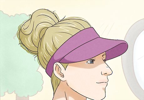 Keep your hair collected and contained. Use a hair tie to put your hair up into a ponytail and pull it through your visor when you put it on. You could also put your hair into a braid to accomplish the same goal. It’s a great way to keep your hair from moving around too much while you wear your visor, especially if you’re planning on being active or playing sports.