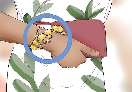 Try a bold statement bracelet for a special event. When you’re heading to a nice event, like a wedding or fancy company dinner, try something out of the ordinary. Go with a thick cuff with a large gemstone, or a string of pearls twisted around your wrist and fingers. Evening fabrics, such as velvet, satin, and silk, also pair beautifully with filigree styles and burnished metals.