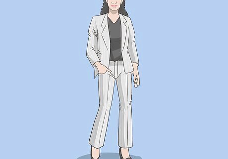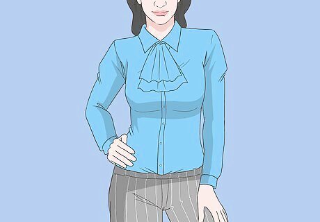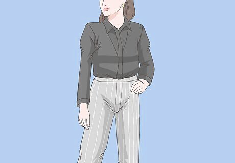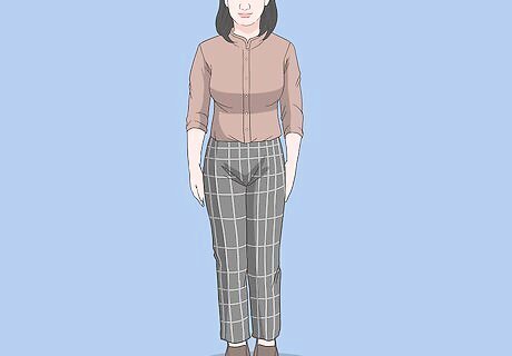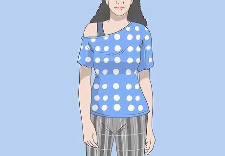 Pull off a mixed-pattern look with a polka-dot top. Choose a blouse with medium or large polka-dots on it if your pants have large, bold plaid squares and stripes. If your pants are more of a subtle plaid (with similar shades of gray and thin lines), opt for smaller polka dots to match. However, this isn’t a strict rule, so feel free to try on a top with different-sized dots and see which one you like best. For a funky look, opt for colored polka dots. Stick to black and white for a more classic look. Keep your accessories (bracelets, necklaces, and rings) to a minimum with this one so your look isn’t too busy. Wear solid-colored shoes and carry a solid-colored bag so your top and pants are the focus.