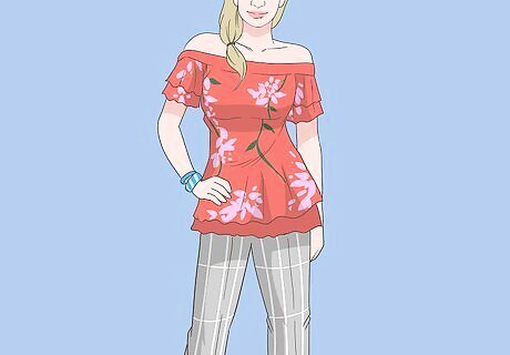 Make a statement with a floral top and gray plaid pants. Choose a large floral print or small floral design depending on the pattern of the pants. If the squares are large and bold, smaller florals (like small print and paisley) can balance out the look. Larger florals look best with plaid that has small checkers and more subtle lines. Dress up the look by tucking the shirt in and donning some pumps. Make it casual-chic by wearing loafers, sandals, or sneakers.