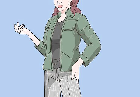 Look laid-back yet edgy with boyfriend-fit pants and a bomber jacket. If your style is more relaxed with some tomboy-vibes, try wearing loose-fitting (boyfriend fit) plaid pants with a black scoop-neck or v-neck shirt. Top it off with a leather or faux-leather bomber jacket with lots of zipper details for a little edge. Complete the look with comfy sneakers, flat booties, or loafers. Go for a more bold, punk look with a red and black striped shirt underneath the jacket.