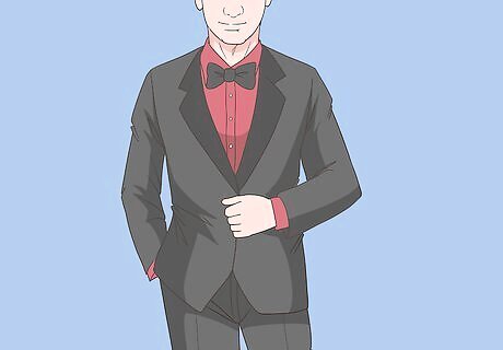 Spiff up your trousers with a tuxedo jacket and a solid dress shirt. Choose a single color (like navy, maroon, or green) for the dress shirt and put on a black tuxedo-style jacket on top. Button it for a more put-together look or leave it open for a clever street-wear vibe. For a more casual vibe, wear a tee or relaxed oxford shirt. To dress it up (or simply add some spunk), add suspenders or a pocket-square.