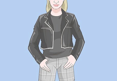 Channel your inner rockstar with plaid pants and a leather jacket. If you like to dress a little edgy, wear your gray plaid pants with a black t-shirt and a black leather (or faux-leather) jacket. Don’t shy away from lots of details on the jacket like zippers, pockets, and interesting stitch lines. Complete the look with sneakers, combat boots, or casual dress shoes. Add some playful pops of color by wearing a graphic tee underneath the jacket. Think of the look as a toned-down version British punk in the 1970s mixed with 1990s grunge! This is a great look regardless of your gender expression!