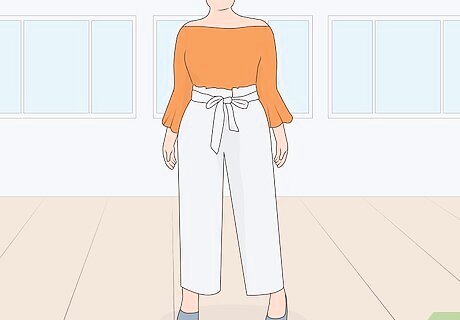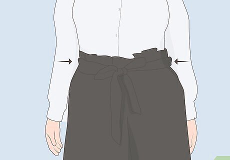 Purchase paper bag pants that are tight in the waist. Paper bag pants shouldn’t require a belt or be loose when you put them on. Make sure your pants stay up on their own and sit at your natural waistline just below the bottom of your ribs. Some paper bag pants have elastic in the waist so that they conform naturally to your body.