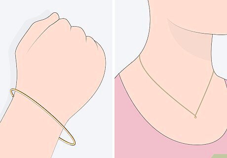 Add thin jewelry to make the pants the focus of your outfit. Jewelry is a great way to make an outfit more formal. Keep any necklaces, earrings, or bracelets that you wear delicate and thin to draw attention to your pants. Gold jewelry looks great with black pants, while silver jewelry pairs well with blues and greens.