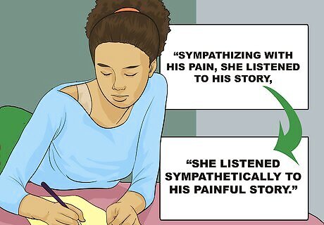 Reduce phrases to words. Reduce descriptive and modifying phrases to one word. Replace a descriptive phrase that follows a noun with one-word adjectives. For example, “People who are experienced with taking photos know how to manipulate lighting,” can be revised to “Experienced photographers know how to manipulate lighting.” A modifying phrase can be reduced to an adverb. For example, “Sympathizing with his pain, she listened to his story,” can be replaced with “She listened sympathetically to his painful story.”