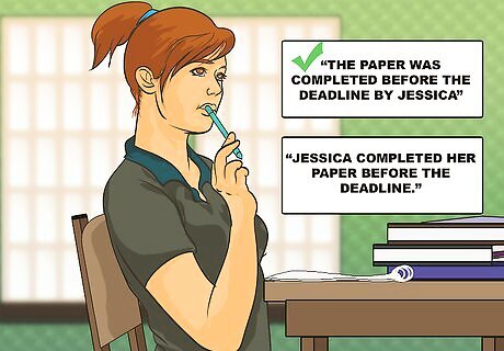 Use active voice. Sentences that use passive voice are much wordier than sentences that use active voice. In active voice, the subject of the sentence is doing the action. For example, “The paper was completed before the deadline by Jessica” is wordier than “Jessica completed her paper before the deadline.”