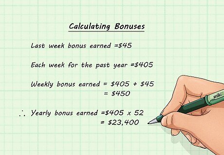 Add on any tips, commissions, or bonuses during the chosen time period. Gross pay includes everything you earn for your work and subtracts nothing. If commission is a regular part of your earnings (if you are in sales, for instance), you may want to try tracking your commissions for a month or a few weeks, then look to see if there are any trends. This can help you if you are trying to plan for the future or earn a specific amount of gross pay. Let’s say that you earned a $45 productivity bonus last week, and have been consistently productive and earned that same $45 each week for the past year. Your new totals, then, are $405 + $45 = $450 weekly, and $405 x 52 = $23,400 yearly. In our example, therefore, your weekly gross pay is $450; yearly, it’s $23,400. This is what you earn during those time periods before any taxes or other deductions are taken out.