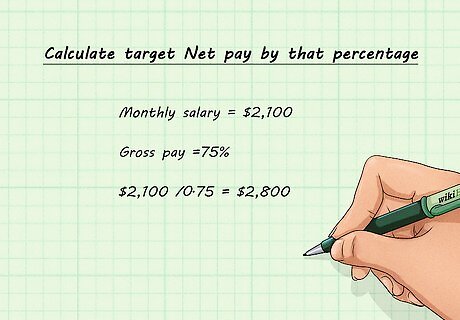 Divide your target net pay by that percentage. If you need to bring home $2,100 monthly, and you know you currently bring home 75% of your gross pay (because of taxes and other deductions), you can determine your gross pay target. The calculation: $2,100 / .75 = $2,800. So, if you want to have $2,100 in take-home pay each month, your target is to earn $2,800 per month ($700 weekly) in gross pay. Please note that this method only provides an approximation, and works best when your current pay and desired pay amounts are close. Varying tax withholding rates, for instance, will throw off the figures if your current net pay is $1,500 monthly and your desired one is $15,000.