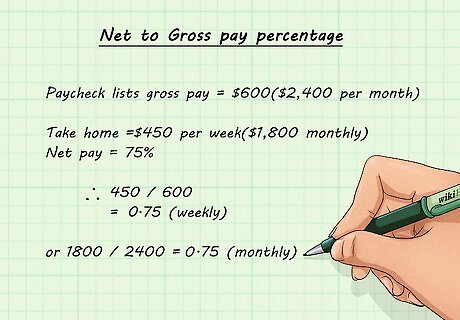 Use a recent pay stub to establish a rough net-to-gross pay percentage. For example, if your weekly paycheck lists your gross pay as $600 (or $2,400 per month), and you take home $450 per week ($1,800 monthly), Your net pay is 75% (.75) of your gross pay. The calculation: 450 / 600 = .75 (weekly), or 1800 / 2400 = .75 (monthly).
