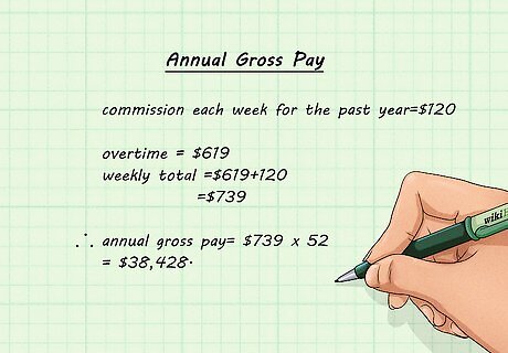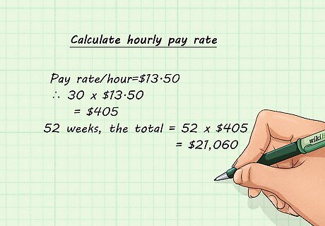 Multiply your hours by your hourly pay rate. Consult your pay stub or your employer if you do not know your hourly pay rate. In our example, let’s make your pay rate $13.50 per hour. Therefore, 30 x $13.50 = $405. Over the past year (52 weeks), the total would be 52 x $405 = $21,060. If math is not your strong suit, or you have a lot of overtime, etc,. to factor in, there are easy-to-use gross pay calculators available online.