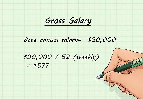 Divide your base annual salary by 12 (monthly), 26 (bi-weekly), 52 (weekly), or 365 (daily). Do this only if calculating your gross pay for a time period shorter than a year, though. For instance, your $30,000 base annual salary is $577 per week ($30,000 / 52 = $577).