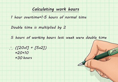 Factor in any overtime or double-time hours. If you work beyond your standard number of hours for a week, or work on a weekend, holiday, or other non-standard time period, you may receive additional gross pay per hour. Overtime is often calculated at a factor of 1.5 times, meaning 1 hour of overtime is paid the same as 1.5 hours of normal time. Double-time is, not surprisingly, multiplied by two. Talk to your employer about the rates for your job. While part-time workers don’t usually get much overtime, let’s assume that five of your hours last week (and each week for the last year) have been “double-time.” Because you were paid double for five of your 25 hours last week, it was the same as working 30 hours at regular pay ([20 x 1] + [5 x 2] = 30).