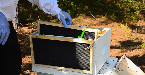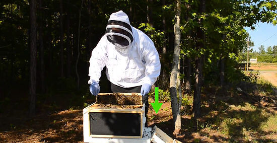 Pull out the frame closest to the side of the bee box, and lay it on the ground. Move the other frames into that place after you have inspected them. Gently lift the frames up, and allow the bees to let go and move out of the way.