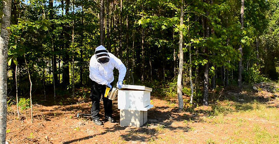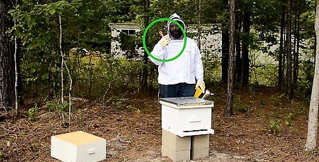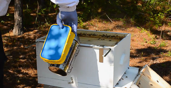 Approach the hive from the back, out of the landing path of the heavily laden bees. Come around to the front, and blow a few puffs of smoke into the entrance of the hive. Move away, and wait 3 minutes.