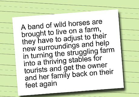 Think about the main conflict in your story. Some possible conflicts include: An orphaned foal struggles to survive in the wild. A band of wild horses are brought to live on a farm. A horse is purchased by a cruel owner. An old horse and a young rider must learn to work together. A group of people acquire a wild horse and try to tame it.