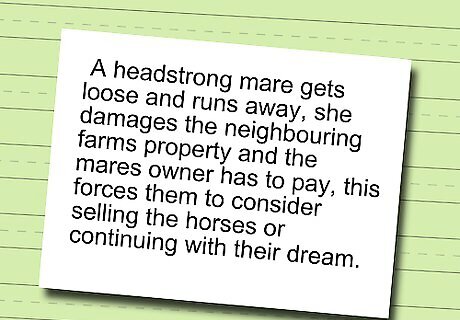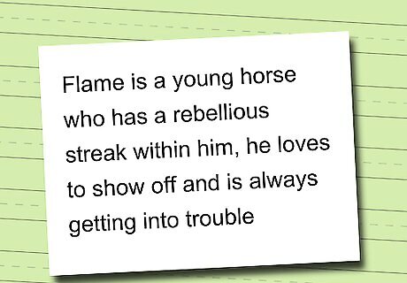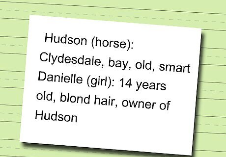 Do some prewriting. List the characters, both horse and human, as well as the setting, and some specific details about them. For example: Hudson (horse): Clydesdale, bay, old, smart Danielle (girl): 14 years old, blond hair, owner of Hudson Start to think about how the different characters may react to each other and what conflicts might emerge. You may also want to draw pictures to help you visualize the story.