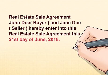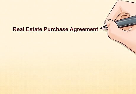Title the contract. There is no right or wrong way to title a contract. It is important for a contract to have a title so that its purpose is clear. This title also allows the parties to easily identify and refer to the contract. The title should be placed at the very beginning of the contract. For instance, the contract could be entitled "Real Estate Purchase Agreement." The contract could then be referred to as "Purchase Agreement," or simply "Agreement" throughout the body of the contract. Similarly, the contract could be entitled "Real Estate Sales Contract." The body of the contract could then use the shortened version of the title, i.e. "Contract," throughout the remainder of the contract.