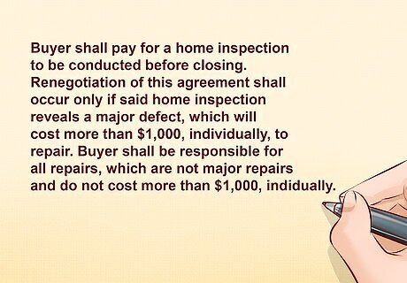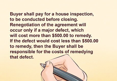 Describe any contingencies. The contract should contain detailed information about any contingency, or an event that can make the contract invalid if it occurs. The buyer would be free to walk away from the contract without penalty if the contingent event occurs. There are some common contingencies that many contracts contain. HSBO contracts are often contingent on the outcome of an inspection of the property. This type of contingency should outline the timeframe in which the inspection should occur. It also should set out which party is responsible for the costs of the inspection. This type of provision can refer to a general home inspection, or a specialized inspection, such as one that tests radon levels. An example of a contingency provision clause in a FSBO contract is as follows: "Buyer shall pay for a house inspection, to be conducted before closing. Renegotiation of the agreement will occur only if a major defect, which will cost more than $500.00 to remedy. If the defect would cost less than $500.00 to remedy, then the Buyer shall be responsible for the costs of remedying that defect." Another common contingency involves the ability of the buyer to get financing. Again, this type of contingency should describe the timeframe that the buyer has to find adequate financing. It may even give details such as the amount of financing that is needed and the name of the mortgage company or financial institution providing the financing. The contract also may contain a contingency based on the ability of the seller to obtain suitable housing. Sometimes, the seller wants to make sure that he or she has another place to live before the property is sold and possession given to the buyer. As a result, FSBO contracts may contain a contingency provision like this.