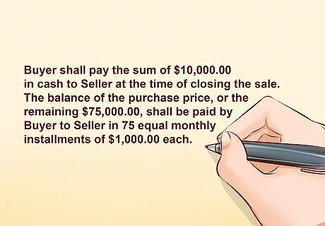 Describe how the full purchase price will be paid by the buyer. Many FSBO contracts require that the buyer obtain financing to purchase the house outright. In this case, the purchase price would be paid in full at the time of the closing of the sale. Other times, the seller may agree for the buyer to purchase the home on contract, by paying monthly installments toward the purchase price over time. The body of the contract should contain very clear language about how and when the purchase price will be paid by the buyer in full. For instance, the contract could read, "Buyer shall pay the purchase price in cash at the time of closing the sale." If the parties intend for the buyer to purchase the property over time, then the payment provision could read, "Buyer shall pay the sum of $10,000.00 in cash to Seller at the time of closing the sale. The balance of the purchase price, or the remaining $75,000.00, shall be paid by Buyer to Seller in 75 equal monthly installments of $1,000.00 each."