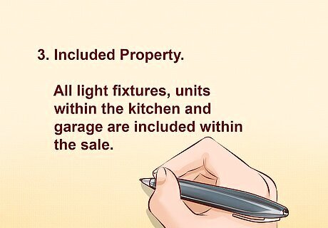 Detail any personal property included in the sale.The body of your contract should specifically name and describe each item of personal property involved in the sale. This is important because both parties to the sale must be absolutely clear on what personal property is included in the sale. For example, appliances, such as stoves, refrigerators, and dishwashers, are often included in the sale of a home, but are not always included. As a result, the contract should specifically describe and list all appliances that the parties intend to include in the sale. Fixtures are another item that are typically included as part of the property being sold in a real estate contract. These are items of personal property that are affixed to the real estate in some way. These might include plants in the yard or other landscaping, as well light fixtures throughout the home. Again, the contract should specifically list those fixtures that are being included in the real estate sale.