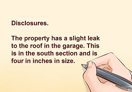Provide all required disclosures. Some disclosures about real estate are required by federal law, and some are required by state law. These disclosure requirements vary greatly from one state to the next. Some states require that you disclose only those defects of which you already have personal knowledge. Other states require a seller to actively search the property for any hidden defects so that they can be disclosed to the buyer. Common examples of defects that may be subject to disclosure are zoning issues, flooding, leaky pipes, and leaky roofs. Some sellers have an inspection done to make sure there are no problems or disclosures to make before putting the house up for sale. Probably the most common disclosure comes from the Residential Lead-Based Paint Hazard Reduction Act of 1992. This federal law applies only to houses being sold that were built prior to 1978. The seller must disclose to a buyer about the possibility of lead-based paint being used in the home. Most state laws provide for a specific standardized disclosure form to be filled out by the seller and given to the buyer. Both parties typically must sign and date the disclosure form. It is usually presented by the seller at the closing of the sale.