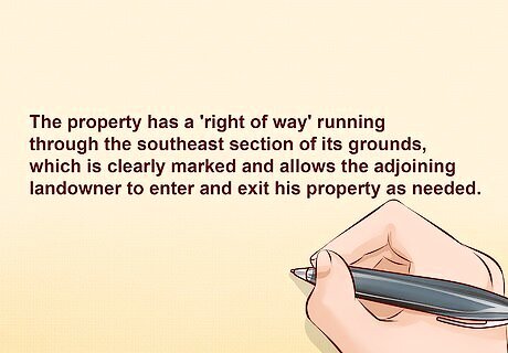 Describe any easements or restrictions on the property. A FSBO contract should contain a clear description of any homeowner’s association restrictions on the property. Such restrictions might affect, for example, lawn maintenance or a fence that the buyer wishes to build on the property. Easements refer to another person or landowner’s interest in the property or a portion of the property. One example of an easement is a driveway that two adjoining properties historically have shared. FSBO contracts regularly contain a provision stating that the Buyer is taking title to the property "subject to any zoning restrictions." A zoning law that affects a particular parcel of property typically restricts how the owner can use the property. In other words, if a property is zoned residential, the Buyer cannot expect to buy the property and turn it into a store. Another common easement provision includes utility easements. It is common for contracts to include a clause that, for example, "permits utility companies to continue using those portions of the property that are necessary for the existing utility services to remain operable." A contract provision relating to another type of easement might state as follows: "The property has a 'right of way' running through the southeast section of its grounds, which is clearly marked and allows the adjoining landowner to enter and exit his property as needed."