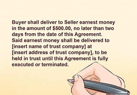 Give details about any earnest money to be paid by the buyer. Earnest money is a percentage of the purchase price that the buyer pays in advance in order to show good faith in proceeding with the sale of the property. Typically, earnest money is between three and five percent of the purchase price. It is usually held in escrow or trust by a title company or financial institution until the sale is complete. The contract terms should include the following: The amount of earnest money to be paid The date on which it should be paid What entity should hold the money A sample earnest money provision might read, "Buyer shall deliver to Seller earnest money in the amount of $500.00, no later than two days from the date of this Agreement. Said earnest money shall be delivered to [insert name of trust company] at [insert address of trust company], to be held in trust until this Agreement is fully executed or terminated."