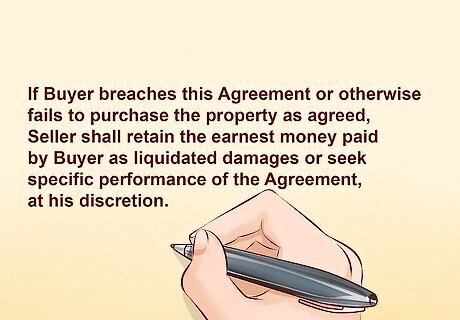 Give detailed information about the consequences of default. The contract should contain information about what happens if either party terminates the contract, which might happen for a variety of reasons. For instance, the contract might provide that if the buyer terminates the contract, the seller will be entitled to receive the earnest money paid by the buyer. This provision might also detail the potential remedies for a party when the other party has defaulted on the contract, such as seeking relief through the court system. For instance, the contract might contain the following provision: "If Buyer breaches this Agreement or otherwise fails to purchase the property as agreed, Seller shall retain the earnest money paid by Buyer as liquidated damages or seek specific performance of the Agreement, at his discretion." This provision allows the Seller to either keep the earnest money paid and terminate the contract, or proceed to file a lawsuit against Buyer claiming a larger amount of damages than the earnest money that was paid. Likewise, a FSBO contract might contain the following clause in favor of the Buyer: "If Seller fails to deliver title to the property to Buyer at closing as contemplated by the Agreement, the Agreement shall terminate and the Buyer shall be entitled to a refund of any earnest money paid." This provision gives the Buyer a specific remedy if the Seller fails to perform the terms of the contract.