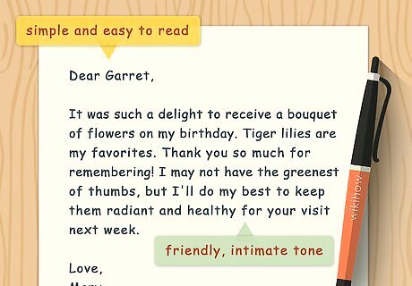 Make sure the note is easy to read. Look over the note for flow and tone. Check that the note includes a specific mention of the gift or service you are thanking the recipient for. Make sure the note has a friendly, intimate tone, especially if you are close to the recipient. Try to keep the language in the note simple and easy to read. The message should be short and to the point.