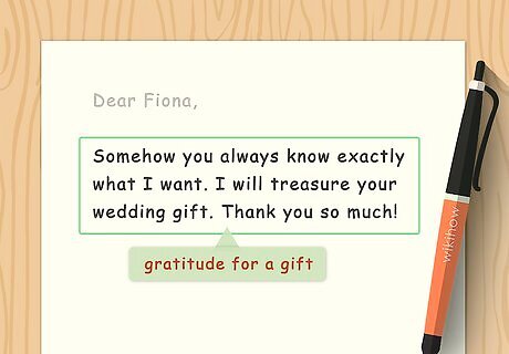 Write a message of gratitude for a gift. If you are thanking the person for a gift, include a message of gratitude about the gift and how much you appreciate it. Say “thank you” and name the gift so the message is personal. For example, you may write “Thank you for the housewarming gift. You’re so kind and I really appreciate it.” Or you may write, “Somehow you always know exactly what I want. I will treasure your wedding gift. Thank you so much!”