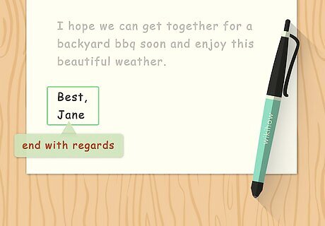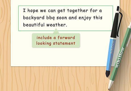 Include a forward looking statement. If you know the recipient well, you may mention when you hope to see them again or that you hope you will talk to them soon. A forward looking statement can add a friendly, casual tone to the note and let the recipient know you are enthusiastic about your relationship with them. For example, you may write, “I look forward to seeing you at the party next week and catching up with you in person.” Or you may write, “I hope we can get together for a backyard bbq soon and enjoy this beautiful weather.”