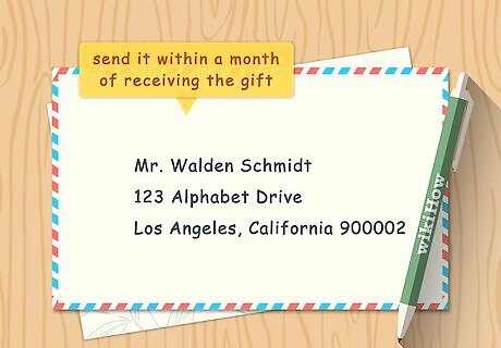 Send the card out within a month of receiving the gift. Once you feel the thank you note is at its best, put it in an envelope and send it out within a month of receiving the gift or service from the recipient. A month is just long enough for the recipient to remember giving the gift and will ensure they are thanked promptly for it. The sooner you can send out the thank you note to the person, the better. Any longer than a month can seem a little rude or tardy for a thank you note.