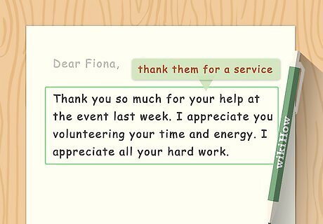 Create a message of thanks for a service. If you are thanking the person for a service or a kind act, mention this in the note. Make sure you say “thank you” and express your gratitude for the person’s help. For example, you may write, “Thank you so much for your help at the event last week. I appreciate you volunteering your time and energy. I appreciate all your hard work.” Or you may write, “Thank you for picking me up at the airport the other day. I’m so lucky to have a friend like you. You’re the best!”