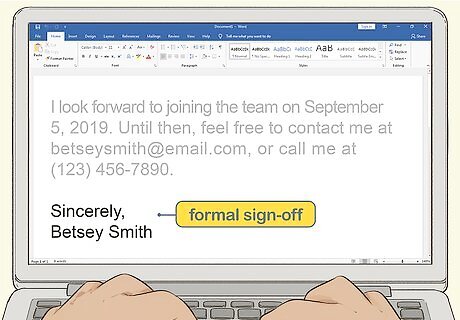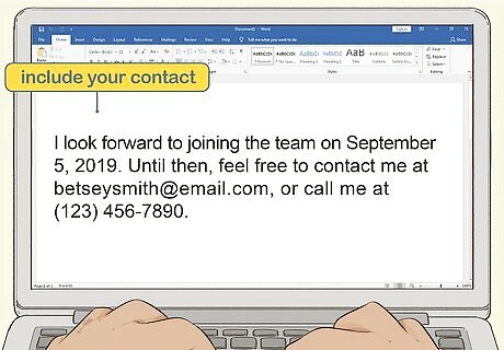 Include your contact information. It's a good idea to include your email address and phone number. You can also include your mailing address if you want. Write something along the lines of, “I look forward to joining the team on September 5, 2019. Until then, feel free to contact me at [email protected], or call me at (123) 456-7890.”
