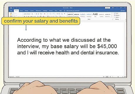 Confirm your salary and benefits. Although you will formally sign a contract with your salary and benefits later on, it's best to have them down in writing as soon as possible. This will clear up any confusion in case you and your employer have different ideas. Write, “According to what we discussed at the interview, my base salary will be $45,000 and I will receive health and dental insurance. If you agreed on other specific accommodations at the interview, this is a good place to mention them. This might apply to you if you have a disability, or are a nursing mother, or need to work from home occasionally for some reason.