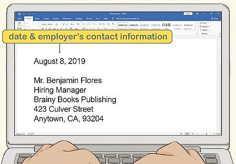 Start with a heading containing your employer's contact information. Starting off with a formal heading is especially important if you're sending your letter by mail, but it can't hurt to make an email look extra professional. Include the date, the full name of the company representative, and the name and address of the company. Format it in a heading like so: August 8, 2019 Mr. Benjamin Flores Hiring Manager Brainy Books Publishing 423 Culver Street Anytown, CA, 93204