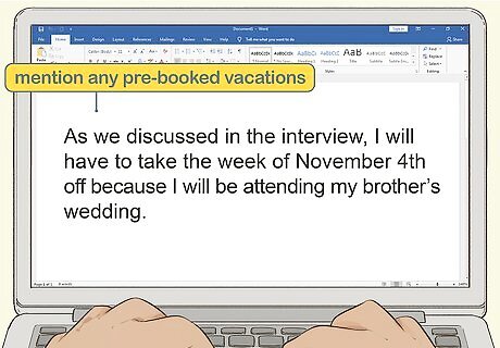 Let your employer know about any pre-booked vacations. It's awkward to ask a new employer for time off before you've even started, but sometimes you have no choice. If you've already booked expensive, nonrefundable plane tickets, or if you have a big event to attend, like a wedding, your employer should work around your schedule. Write, “As we discussed in the interview, I will have to take the week of November 4th off because I will be attending my brother's wedding.” Mentioning your trip in your acceptance letter makes your acceptance contingent upon them giving you this time off, which is a good way to make sure they follow through. Think about it: if your employer won't let you take time off for a really important event, then you probably don't want to be employed by them.