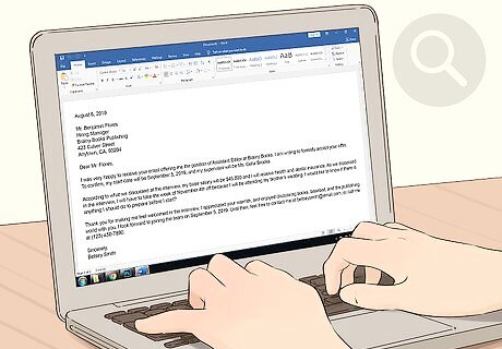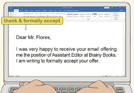 Thank your new employer for the offer and formally accept. Inform the employer of your decision and express your gratitude for the forthcoming opportunity. Address your letter to the person in the company who directly offered you the position. For example, write, “Dear Mr. Flores, I was very happy to receive your email offering me the position of Assistant Editor at Brainy Books. I am writing to formally accept your offer.” Keep the introduction brief and professional. Be as enthusiastic as feels authentic to you. There is no need for a lot of gushing about how you've wanted this job since you were a kid. You can, however, add in a sentence about how you'll be a good match for the job. For example, “I know that I'll be a good match for the job and am excited to start.”