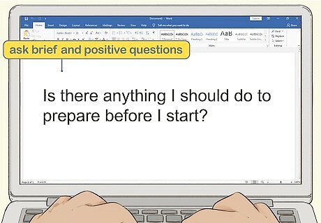 Ask any questions you have. If you have any lingering questions about the job, mention them near the end of your letter. This is a good place to put in any questions that you didn't have a chance to ask at the interview, or that you thought of afterward. Keep the questions brief and positive. For instance, it's fine to ask, “Could you put me in contact with other women of color who work at the company?” or “Is there anything I should do to prepare before I start?” but it's probably not a good idea to ask, “Is it okay if I quit in two months?” or “Do you have any tips for not dying of boredom in the office?”