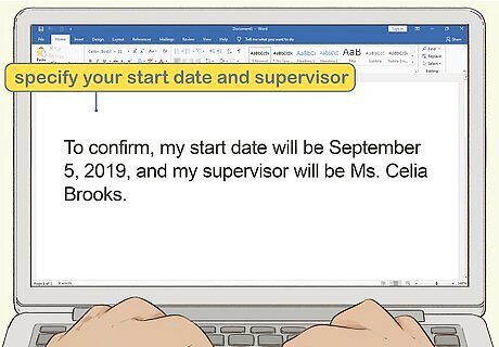 Specify your start date and supervisor. The acceptance letter is a great place to get down in writing the details that you discussed verbally in the interview. Write, “To confirm, my start date will be September 5, 2019, and my supervisor will be Ms. Celia Brooks.” To suggest a start date that you haven't discussed before, write, “I would like to start on September 5, 2019, and am open to discussing if another would work better.” If you know what team you'll be working on, mention it. “I'm looking forward to meeting the rest of the [name] team.”